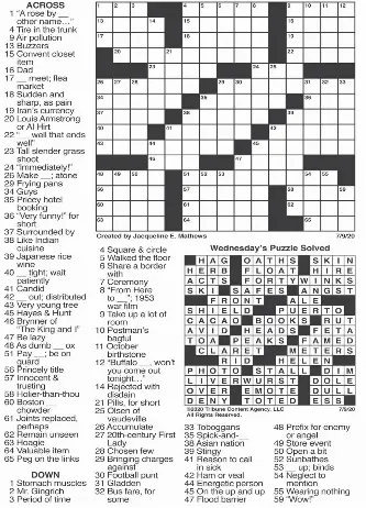Daily Commuter Puzzle Jacqueline Mathews : Posted tuesday, may 22, 2018 12:00 am.. The daily commuter puzzle uses straightforward clues to appeal to new puzzle solvers or those with limited time. Winningham 17 mac maker 18 dog trainer's goal 20 golly!. There are a variety of choices when you're trying to find printable crossword puzzles by jacqueline mathews. Jackie mathews has been creating crosswords for more than two decades for newspapers and other publications across the country. About the daily commuter puzzle jackie mathews has been creating crosswords for more than two decades for newspapers and other publications across the country.
